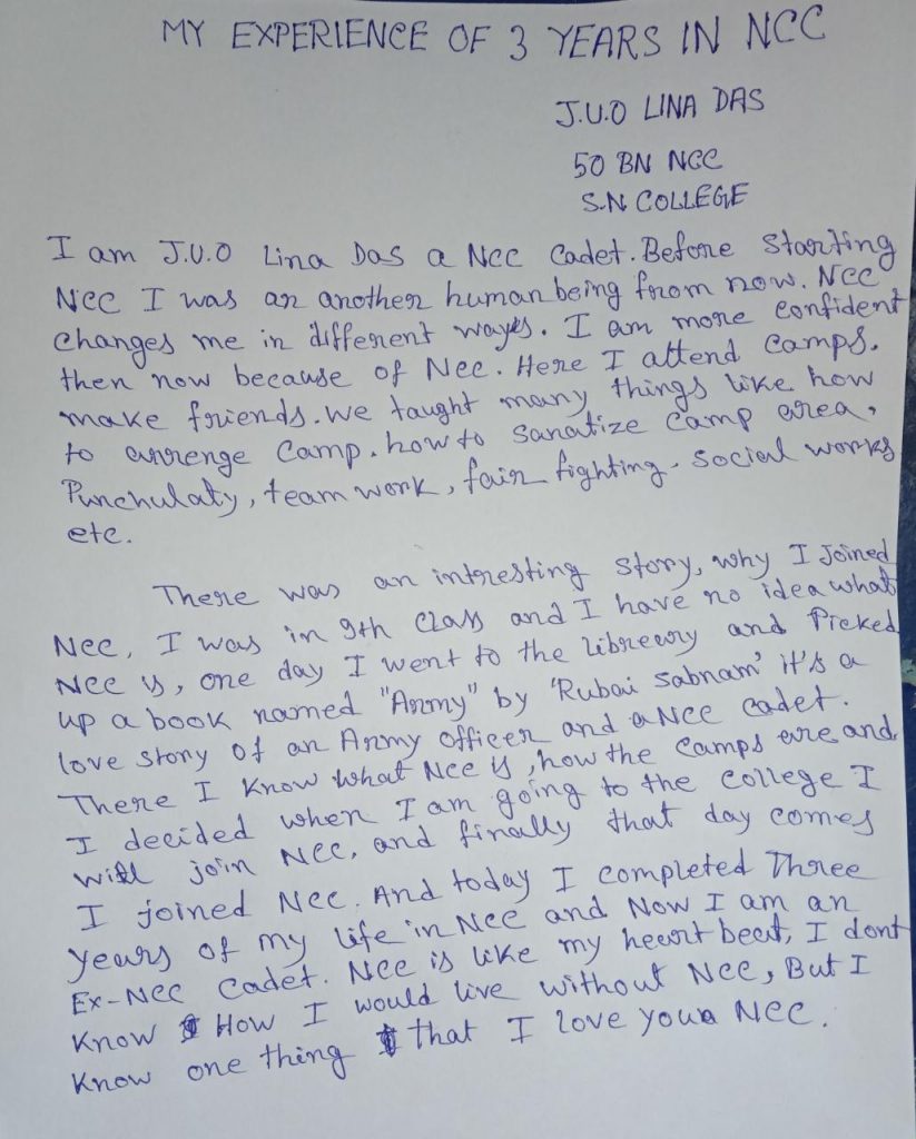 I am JUO LINA Das Regiment no- WB19SWA197735 From SN College 50 BN NCC Burdwan Group west Bengal &sikim directorate