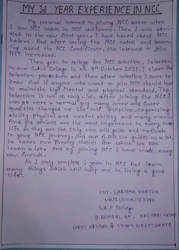 Cadet's name-Jyotsna Kosley Regimental no. -CG / 21 / SW / A 683 373 Battalion name-01CG GIRLS BATTALION PARCHANPAL