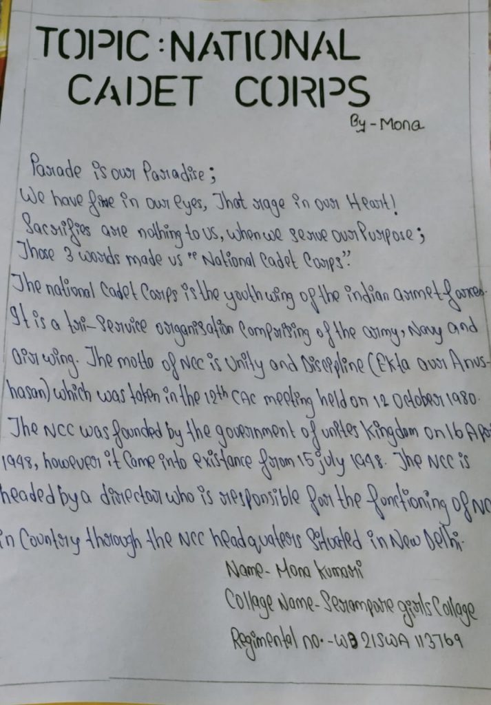 Name- Mona kumari Regimental no.-WB21SWA113769 Unit-2 Bengal Girl's battalion Group- kol B West Bengal & Sikkim Serampore girl's college
