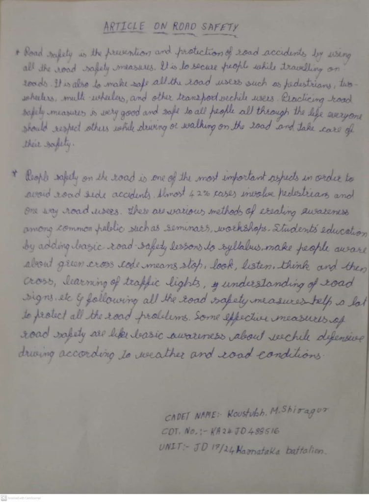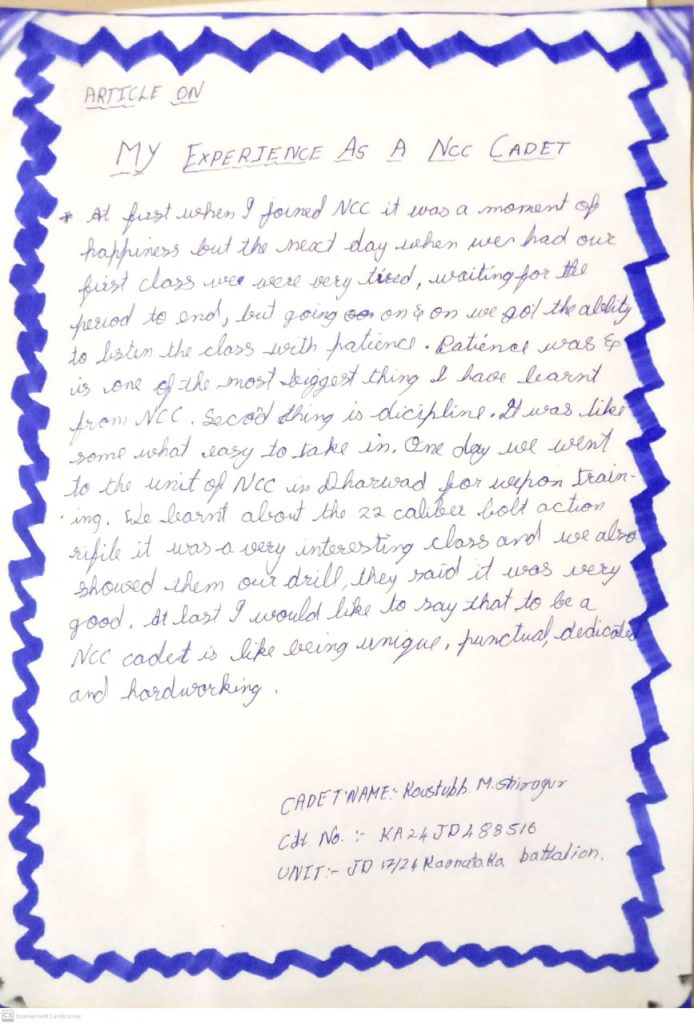 I am Praveen Ankalagi 17 (A) 24 K BATTALION Cadet Number kA 21 JD 488509 Rastrotthana Vidya Kendra Dharwad