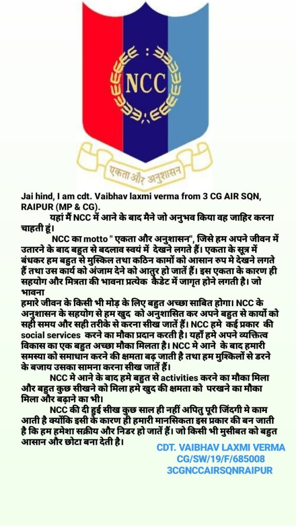 I am cdt. Vaibhav laxmi verma. Reg. Number - CG/SW/19/F/685008 from 3 CG AIR SQN RAIPUR . I am sharing here my experience in ncc...