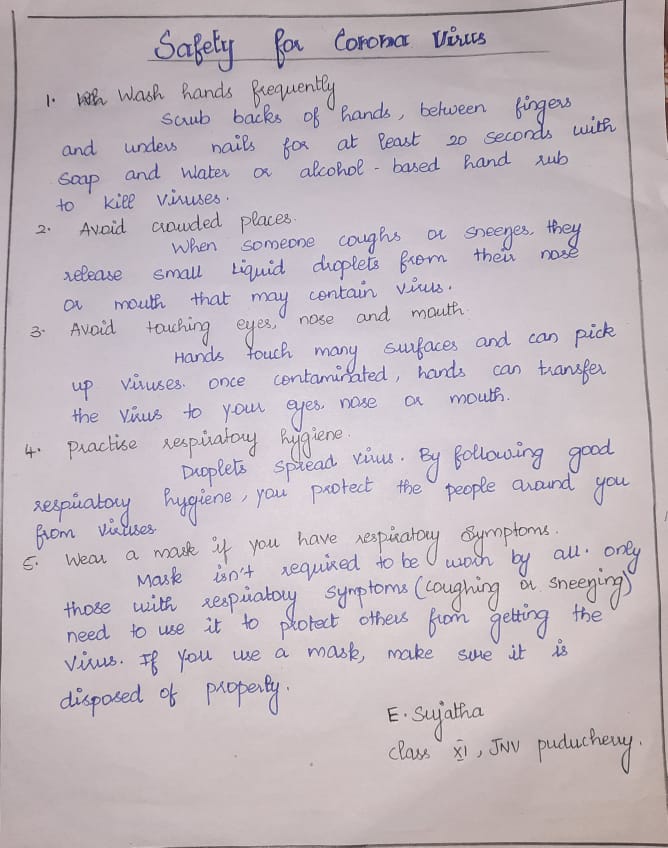 I am Sujatha Egambaram. I study in jnv pondicherry. I am an ncc cadet. I love ncc and I have written about how to be safe from corona virus.