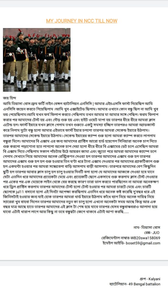 JUO TIYASHA BOSE, 49 BENGAL BN NCC, RBC MORNING COLLEGE, KALYANI GROUP, WB & SIKKIM DTTE
