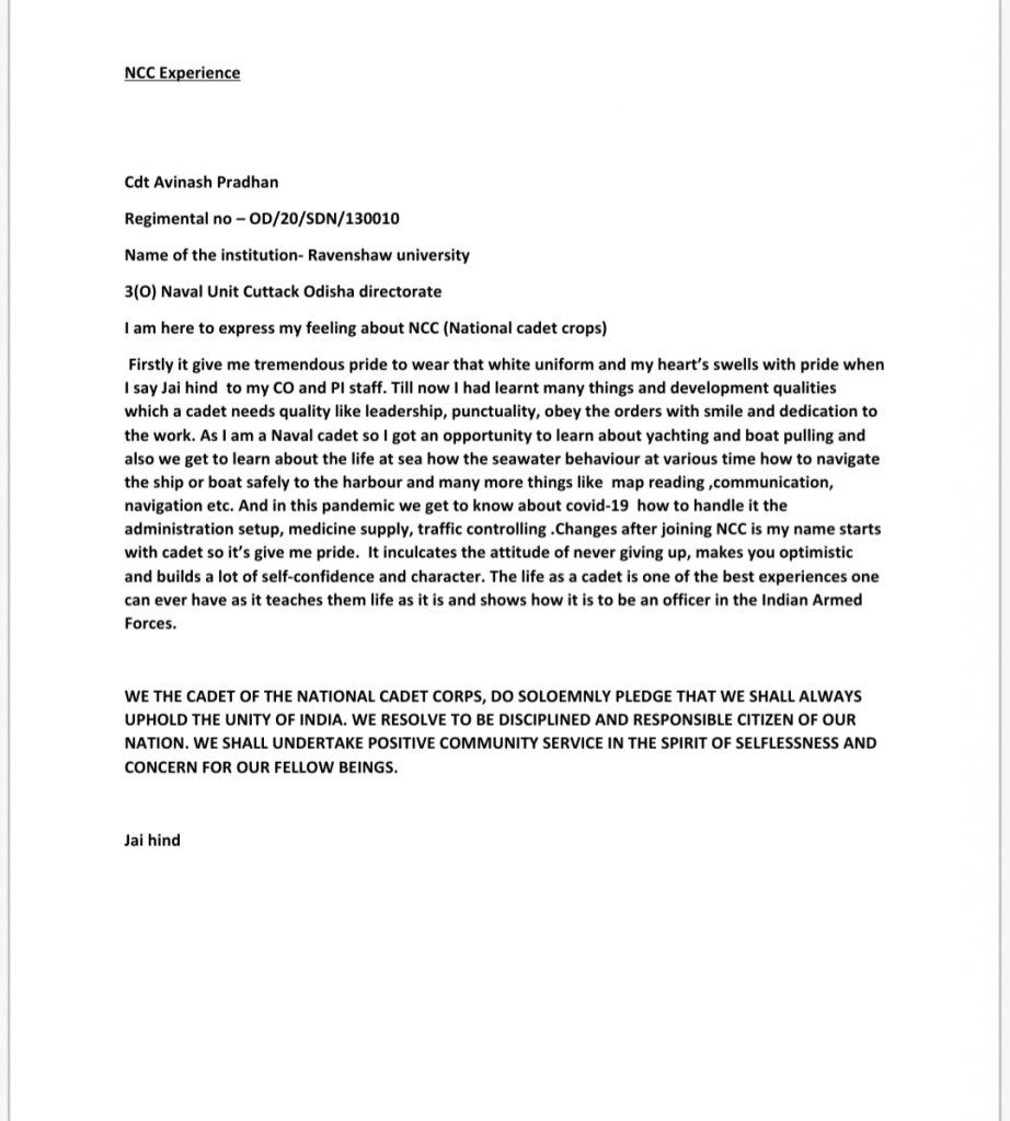 Name - Cdt AVINASH PRADHAN Regimental no - OD/20/SDN/130010 Institution name - Ravenshaws university 3(O) Naval Unit Cuttack Cuttack headquarter Odisha Directorate