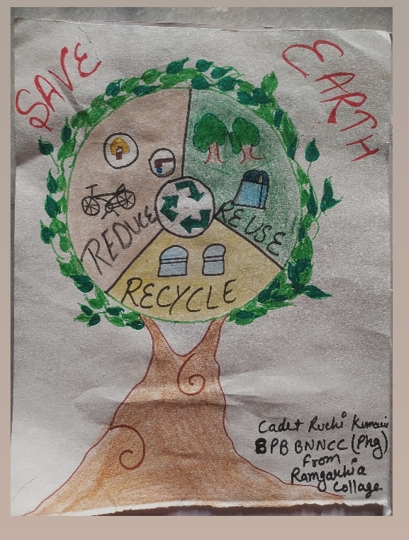 Jai hind ?? I m 1st year Cadet Ruchi Kumari unit 8 PB BN NCC Phagwara from Ramgarhia collage, ?Save Earth ?we should apply three things in our life to save environment ♻️ REDUCE ♻️ RE-USE ♻️ RECYCLE♻️ jai hind