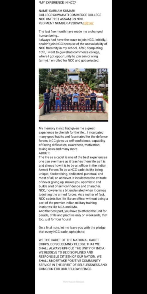 I Cdt.sabnam kumari of guwahati commerce college feels very hpy to share my experience