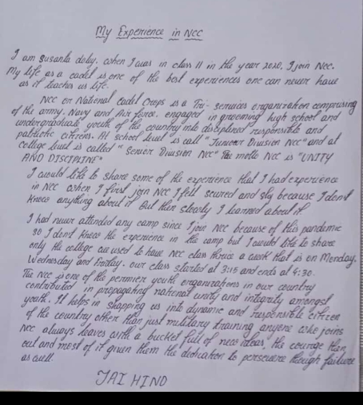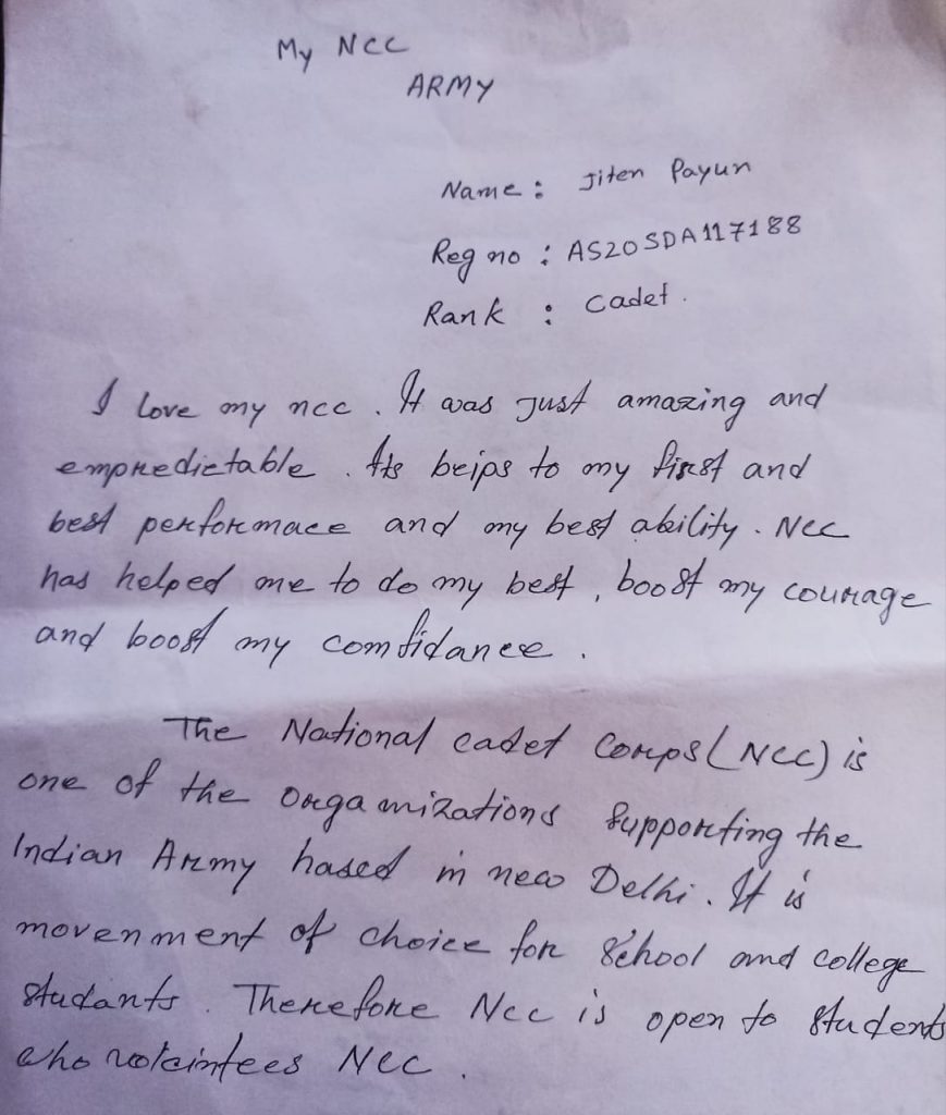 Name: Bhaskar Gam; Reg No: AS/19/SDA/117833; Content: My Experience in NCC; Unit: 9 Assam BN NCC;jorhat group; College: Majuli college