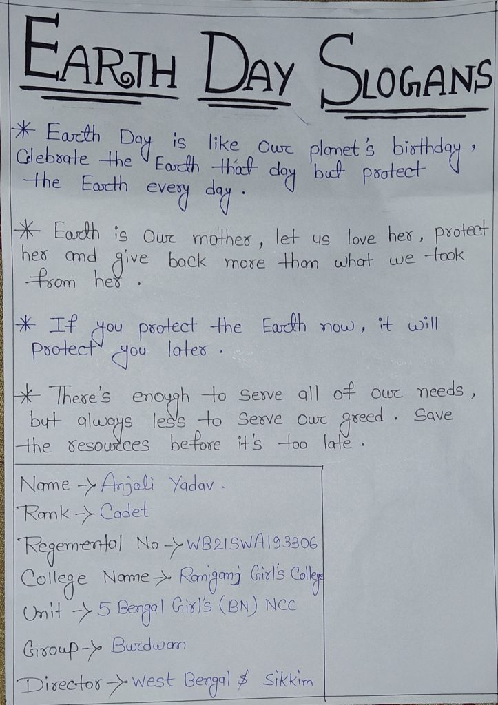 Rank name - cadet shreya dey Regimental num- WB20SWA193349 College name-Raniganj girl's college Unit - 5bengal girls and battalions Group - Bardhaman group Directorate - West Bengal and sikkim directorate .