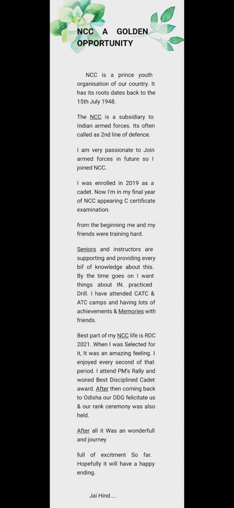 I've experienced the best in NCC. As a cadet, I enjoy being a part of this organisation and recommend Youth to join too. No matter if we're a part of this organisation or not we all should help in our nation building. Thank you NCC.