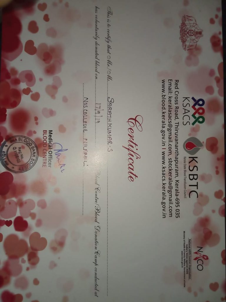 Name : Sarath Kumar S College : NSS college, Nilamel Battalion : 1K(BN) NCC Activity : Blood donation