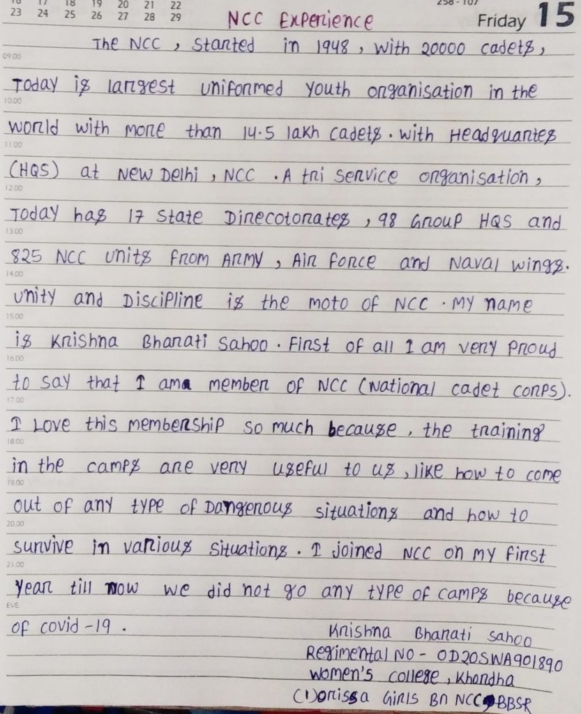I am NCC Candet , Krishna Bharati Sahoo Regimental No_ OD20SWA901890 (1)Orissa Girl's Bn NCC, BBSR Women's Degree College , Khordha