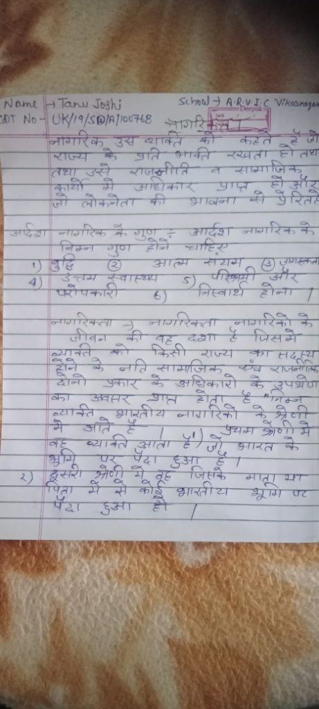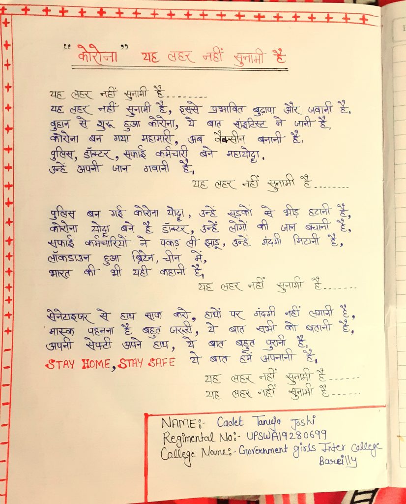 NAME: CADET TANUJA JOSHI REGIMENTAL NO : UPSW19280699 BATTALION : 8 UP GIRLS BATTALION COLLEGE : GOVERNMENT GIRLS INTER COLLEGE BAREILLY