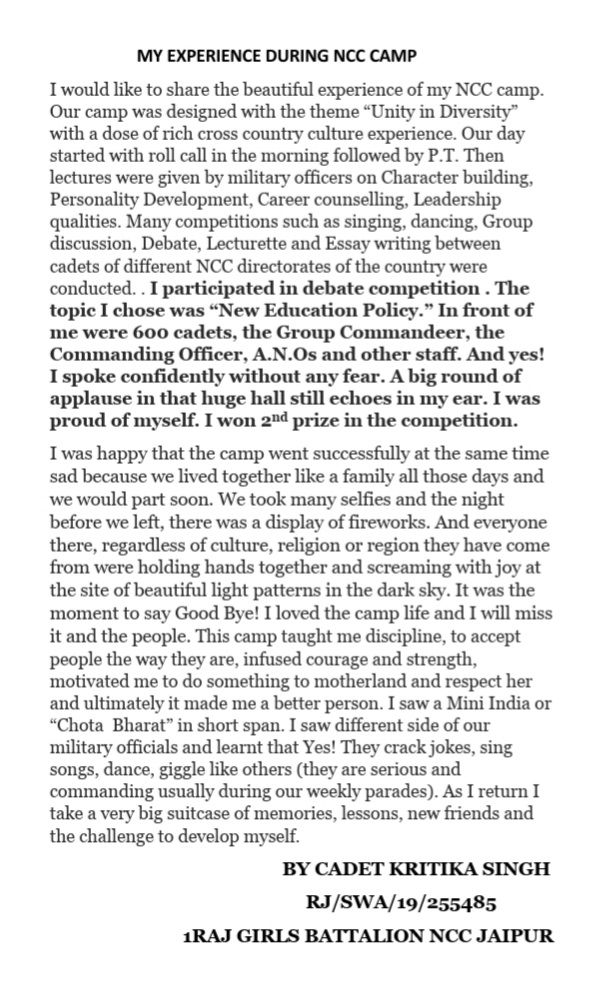 Jai Hind, myself Cadet Kritika Singh from 1RAJ GIRLS BATTALION NCC JAIPUR. Currently pursuing my degree in BSc Mathematics from BANASTHALI VIDYAPITH . My aim is to serve my nation and lay down my life for my country India .