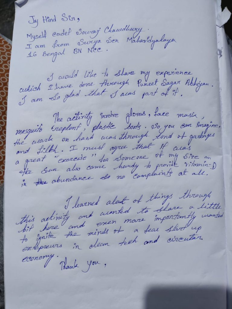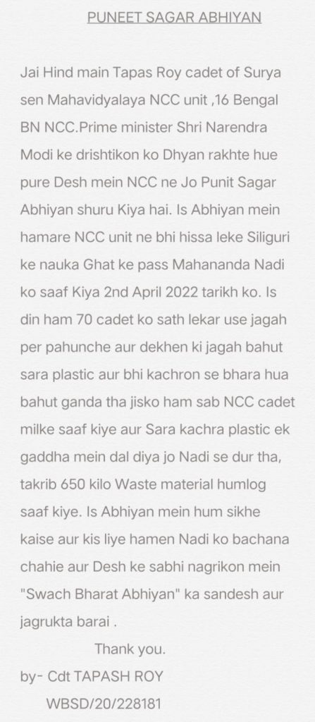 Article about Puneet Sagar Abhiyan Written by cdt TAPASH ROY, rgt no.WBSD/20/228181 Surya Sen Mahavidyalaya,16 Bengal BN NCC