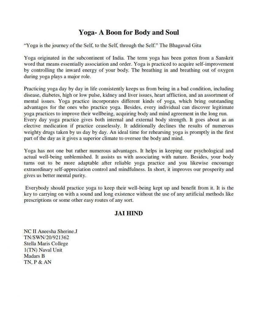 Jai Hind! I'm NC II Aneesha Sherine from Stella Maris College (1(TN) Naval Unit , Madras B). This is a short article on yoga and it's benefits. Kindly do give it a read. Thank you!