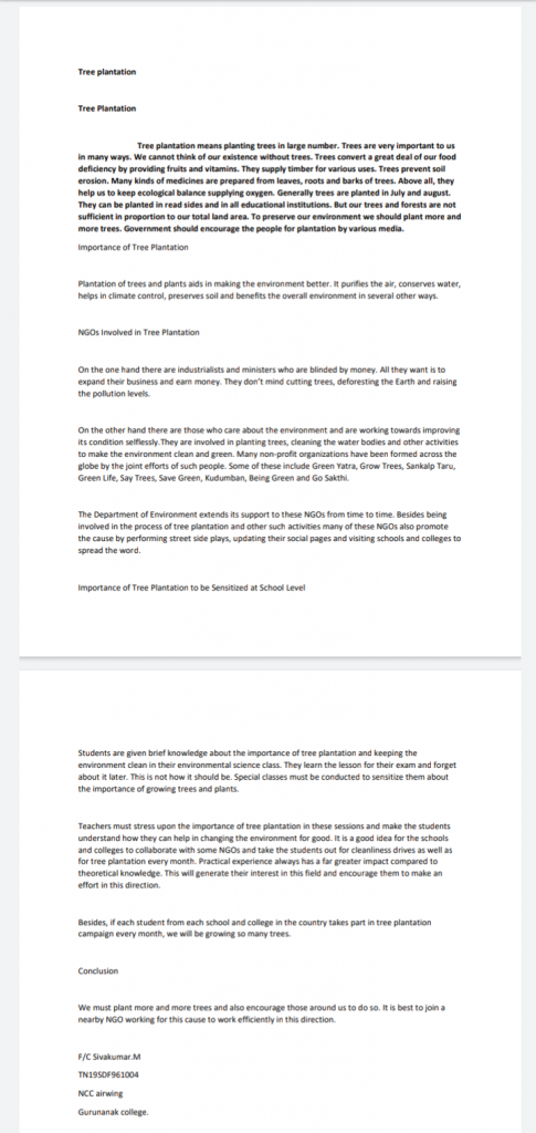 This is an article written by Cadet Shivangi Pandit (Reg no.- DL20ASW900327) on the topic tree plantation highlighting the importance of trees in our life and future generations.