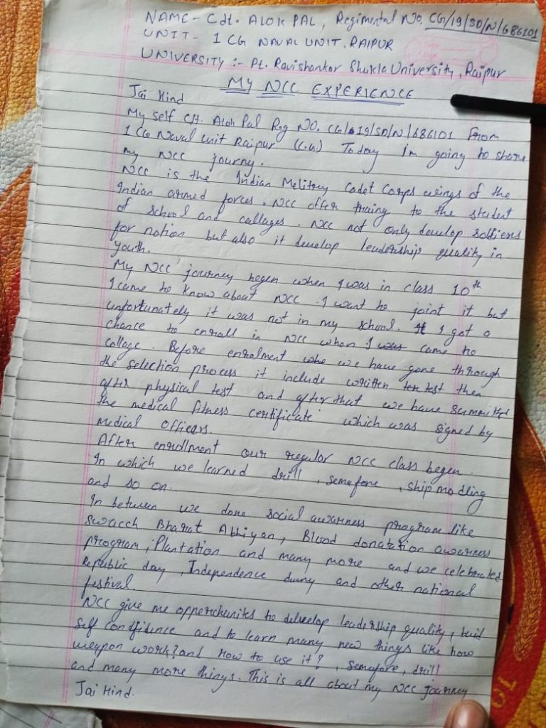 My Name is Cadet Alok Pal . My Regimental No. is CG/19/SD/N/686101.