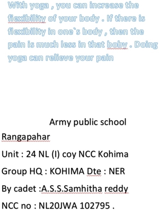 I cadet Samhitha Reddy from army public school Rangapahar. Unit : kohima. Dte : NER. Group HQ : kohima Dte . NCC no. : NL20JWA 102795 . Thank you Jai hind .
