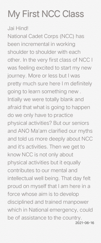 Jai Hind! I am L/CPL Priti Sheoran of 3 HAR GIRLS BN NCC, Hisar of the ROHTAK GROUP of the PHHP&C DTE wanted to share my first NCC class experience through the above attached article.
