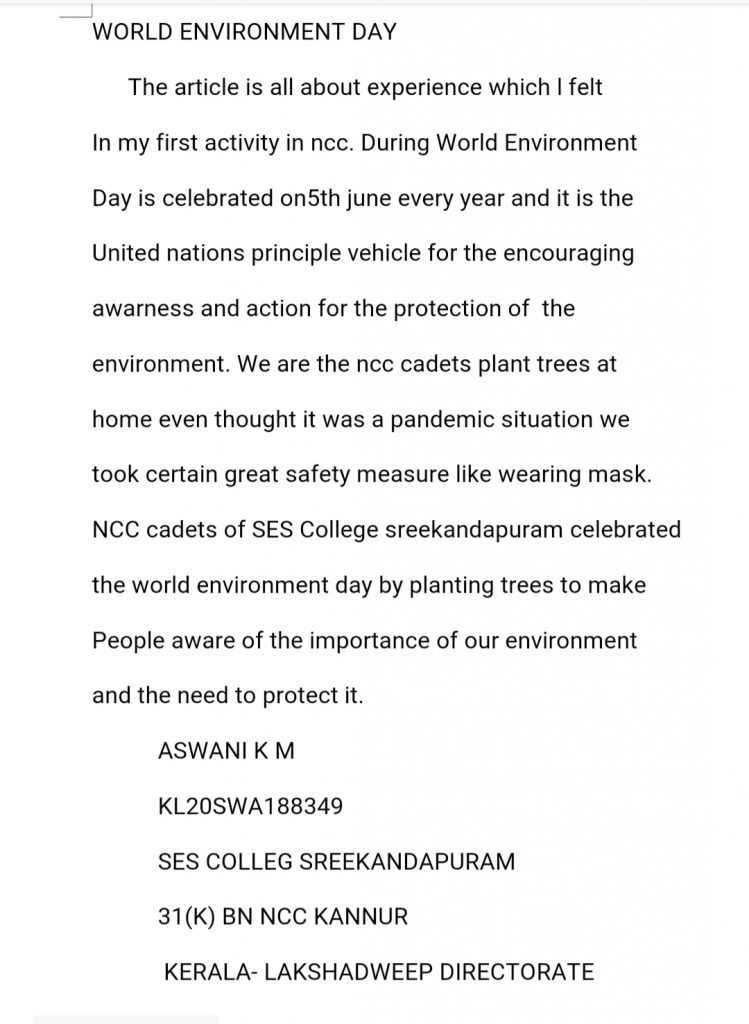 I am aswani km studying 1st year economics lam a student and NCC cadet of SES college sreekandapuram under 31(K)BN NCC KANNUR or Calicut group under Kerala -Lakshadweep Directerate.