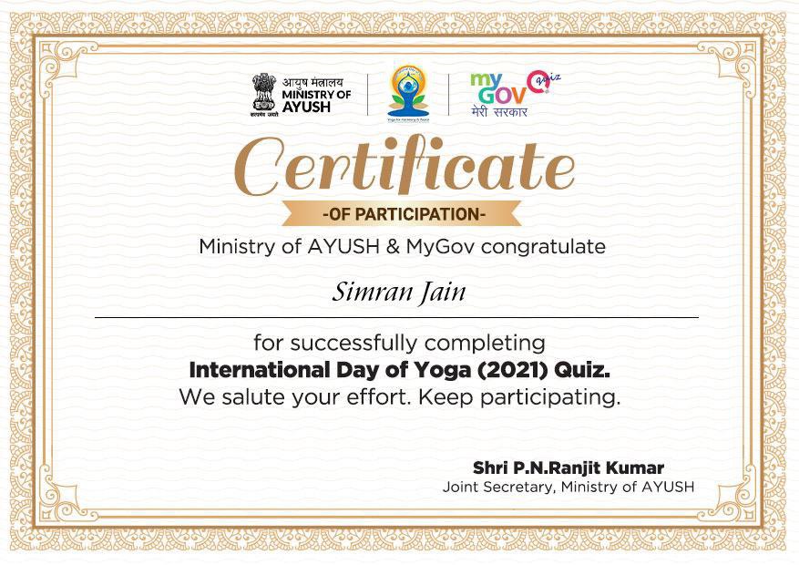 Jai hind Myself JUO SIMRAN JAIN ,I have recently participated in yoga day quiz because I feel yoga is a very powerful tool given to us by our ancestors, we should preserve this age old technique and spread awareness about it.