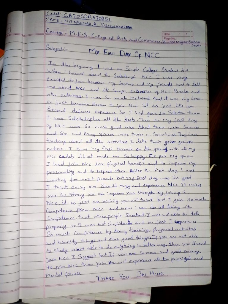 My regimental number is TN20SWA670116. I am Cadet Swarna S of EME platoon from Unit 1 (TN) CTC NCC Army of Madras ‘B’ Group. Tamil Nadu, Pondicherry, Andaman and Nicobar Directorate. My native is Madurai, Tamil Nadu.