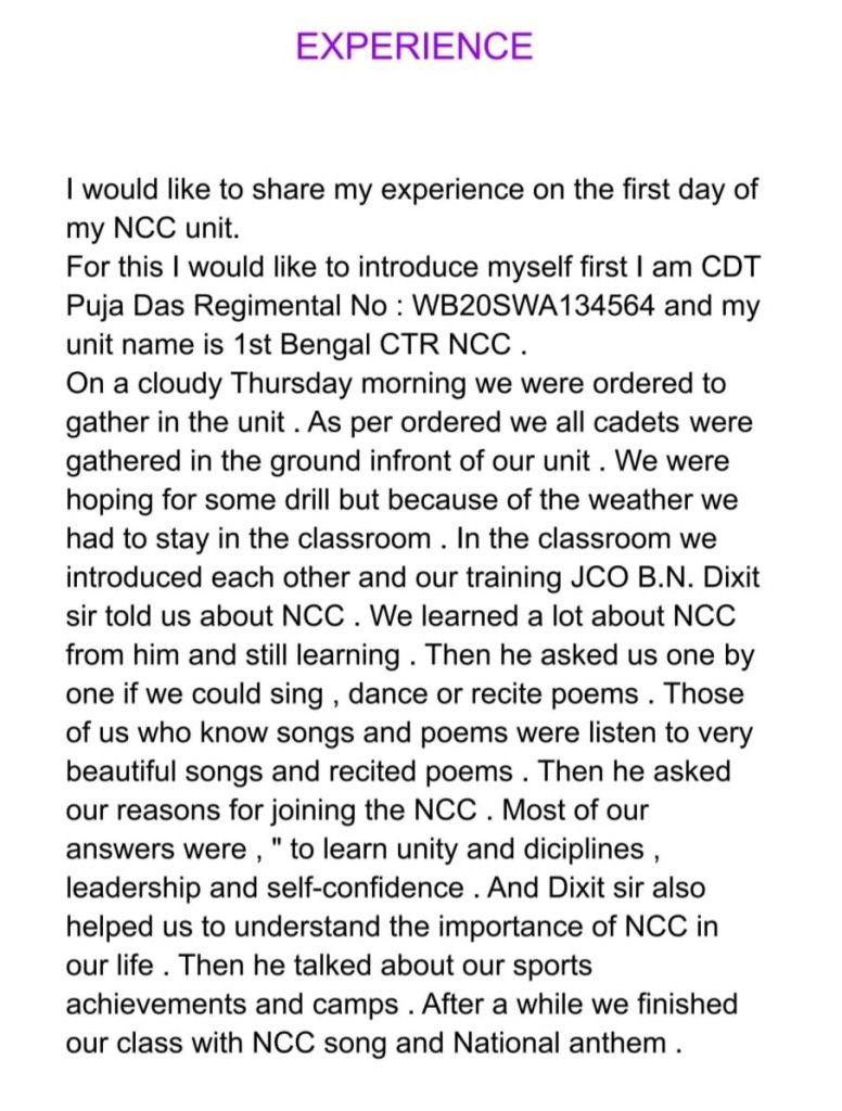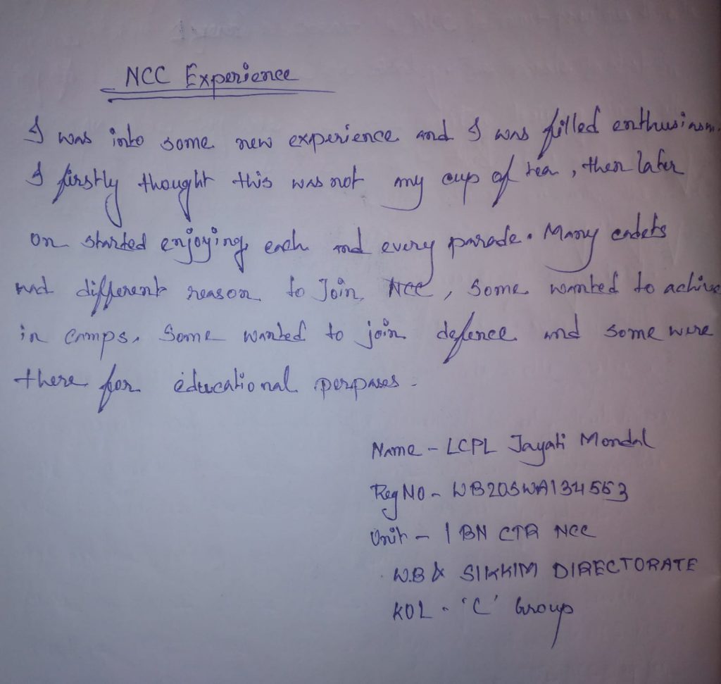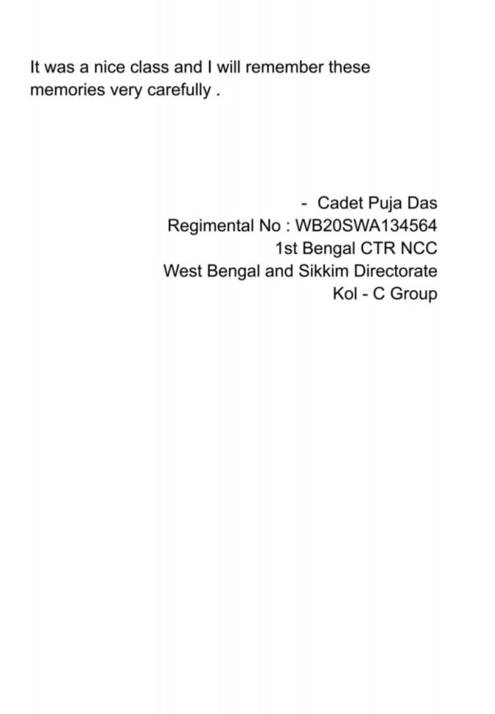 I AM LCPL PUJA DSA , REG NO WB20SWA134564 FROM 1 BN CTR NCC, WB & SIKKIM DIRECTORATE , KOL C GROUP .
