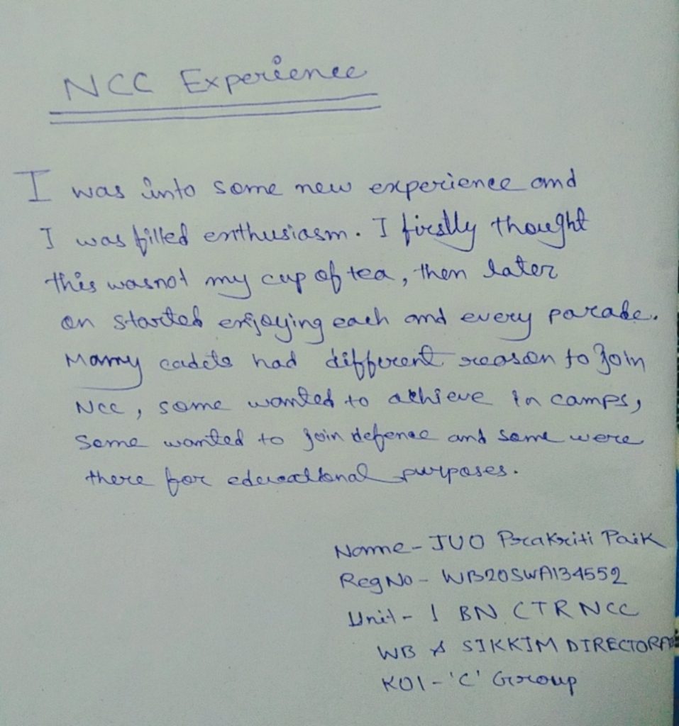 I AM JUO PRAKRITI PAIK . REG NO - WB20SWA134552 FROM 1 BN CTR NCC ,WB & SIKKIM DIRECTORATE , KOL C GROUP .