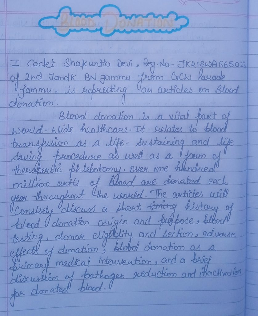 Jai hind I cadet shakuntla devi I want to represent an article of blood donation