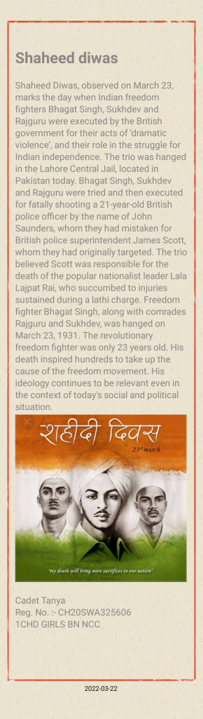 Cadet Tanya Reg. No. :- CH20SEA325606 1 CHD GIRLS BN NCC