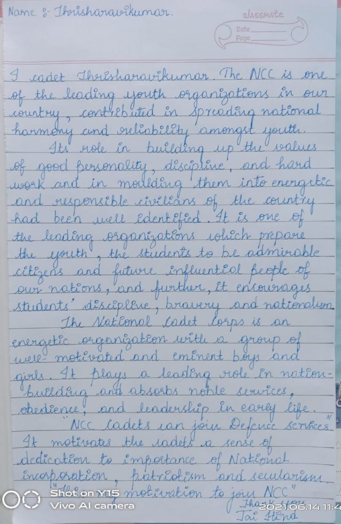 My name is Nandana Jayan.I am coming from Cherthala.I am studying in G.G.H.S.S.Cherthala.I am joined in NCC in 2020.