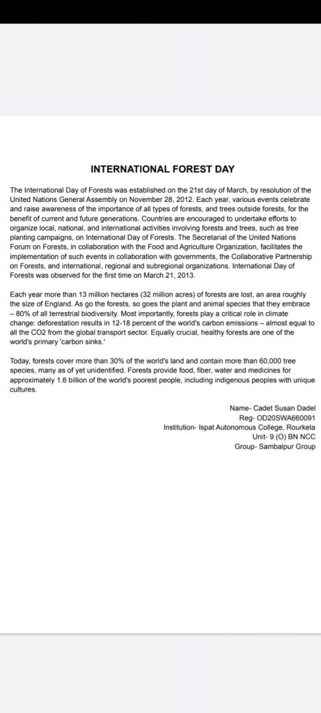 Name- Cadet Susan Dadel Reg- OD20SWA660091 Institution- Ispat Autonomous College, Rourkela Unit- 9 (O) BN NCC Group- Sambalpur Group