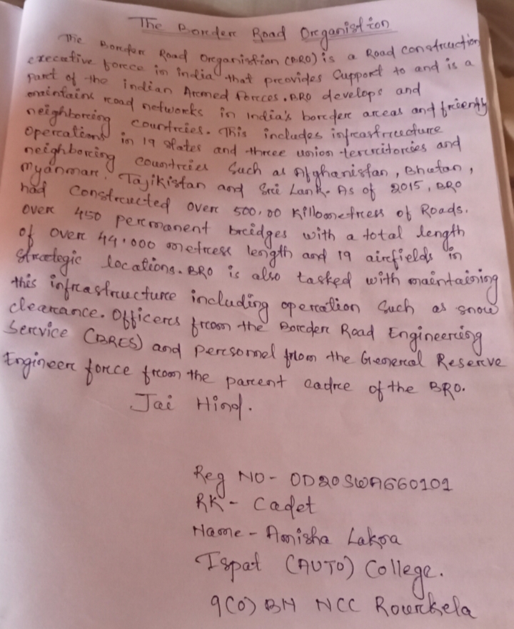 No. -OD20SWA660102 Rank-Cadet Name-Cadet Laxmi Pradhan Inst. Name- Ispat Autonomous College Unit- 9(O) BN NCC, Rourkela