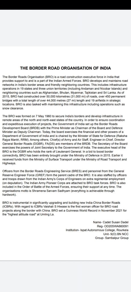 Name- Cadet Susan Dadel Reg- OD20SWA660091 Institution- Ispat Autonomous College, Rourkela Unit- 9 (O) BN NCC Group- Sambalpur Group
