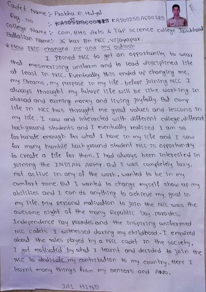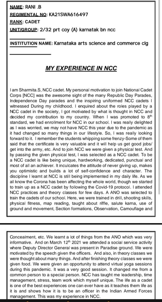 My self rani and i am a SW cadet from unit 2/32 prt coy (A) karnatak bn ncc batallion Bellary