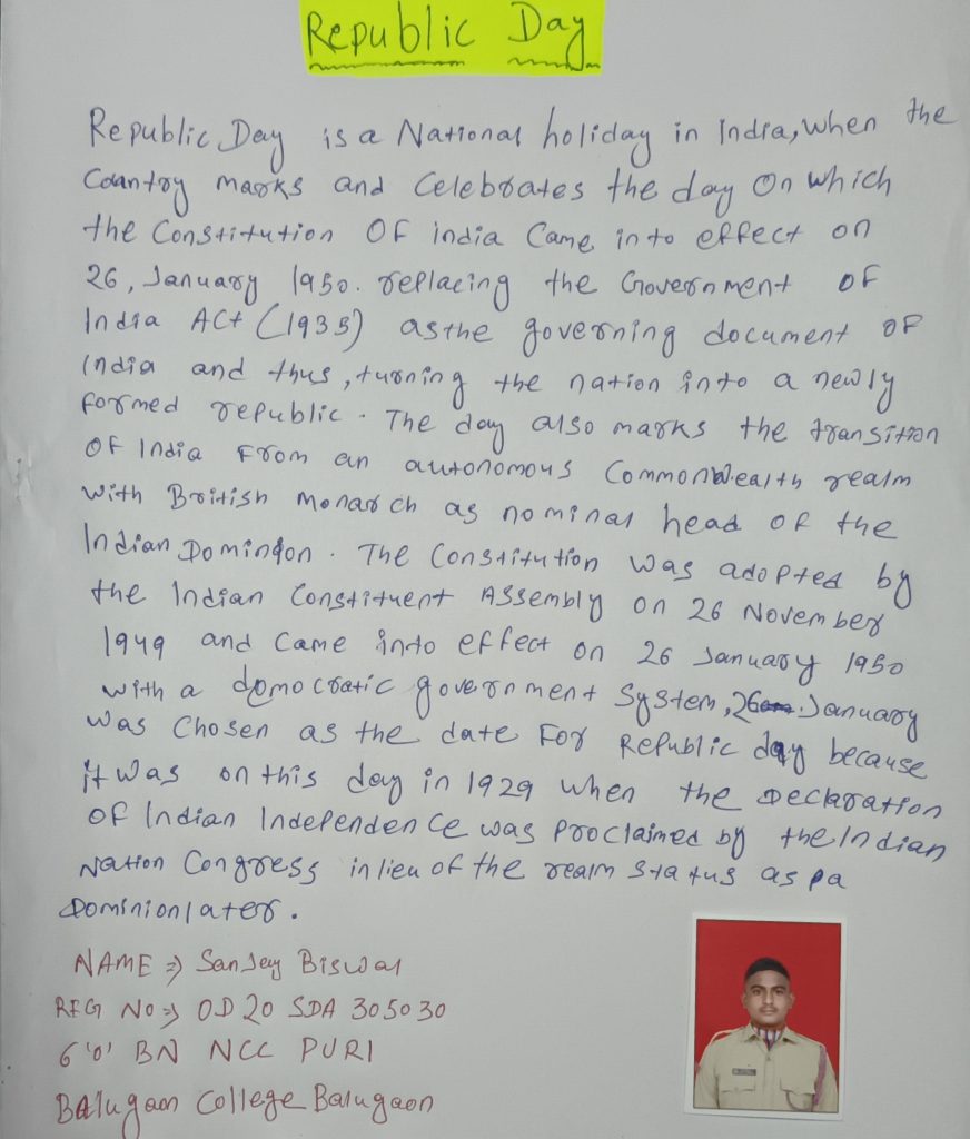 Name :- Cadet Sonu Behera Regimental no :- OD/20/SD/A/304-343 Institute :- Rajdhani college, Bhubaneswar