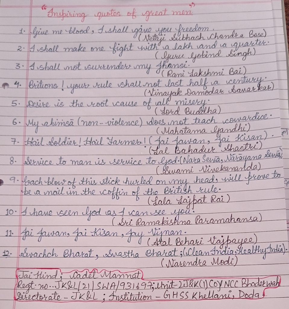 Jai hind Cadet mannat Regt no..JK &L /21/SWA/931697 Unit_2JAnd K (I) COY NCC Bhaderwah Directorate _JK &L Institution _ GHSS khellani ,doda