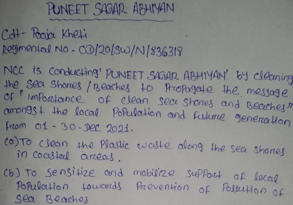 I'm CC Smita Hasini Pradhan from 4 (O) Naval Unit NCC Bhawanipatna persuing as Mechanical Engineering in Government College of Engineering Kalahandi Bhawanipatna. I have written an article on Puneet Sagar Abhiyan.