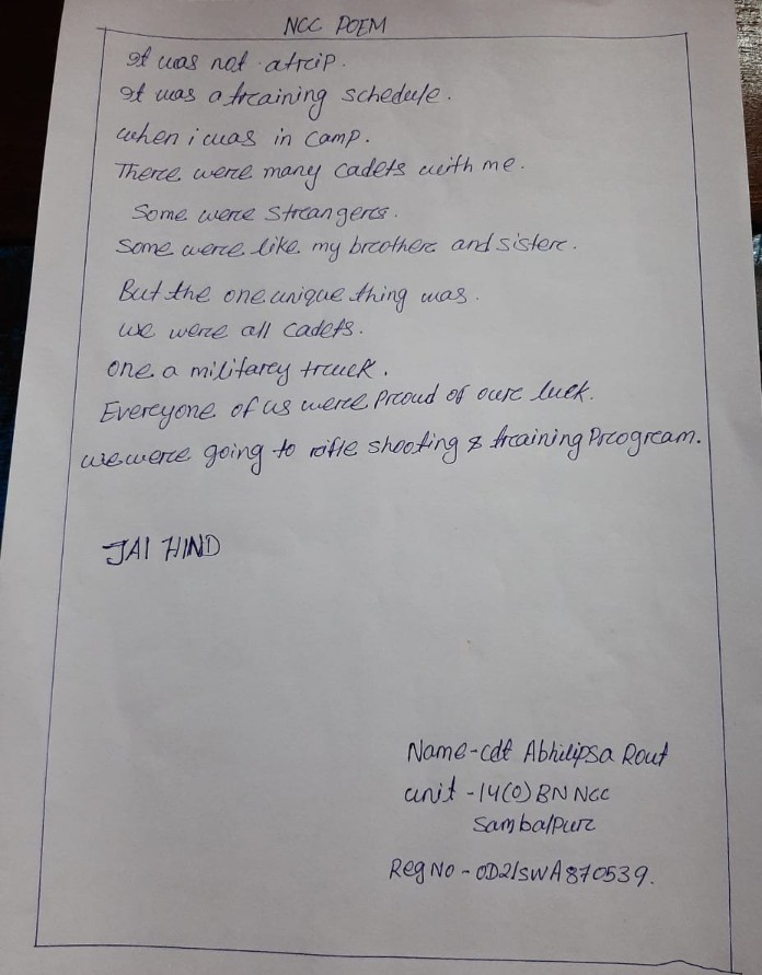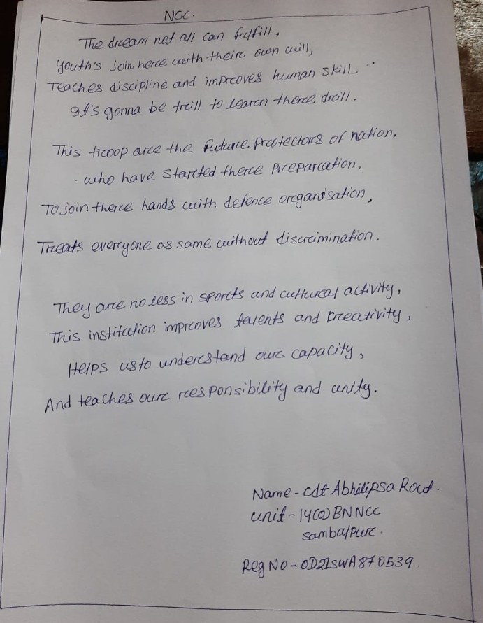 Cadet Risimitra subhadarshan khuntia Enrolment number - OD/20/SD/N/830345 UNIT-4(0)NAVAL UNIT, BHAWANIPATNA College - Government college of engineering kalahandi, Bhawanipatna