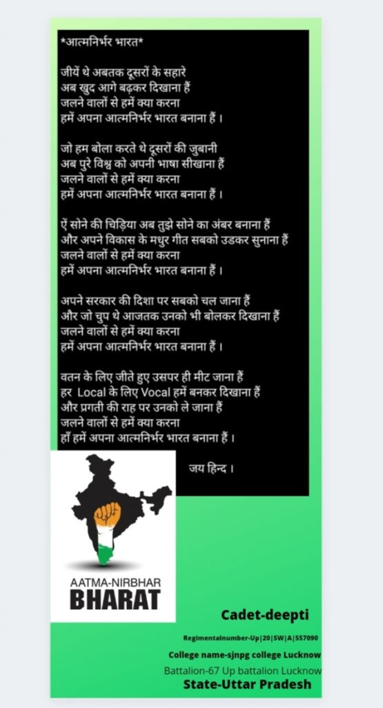 We are lucky because we live in self reliant india.and we proud to say independent India.. NCC cadet deepti form 67 UP BN LUCKNOW Uttar Pradesh
