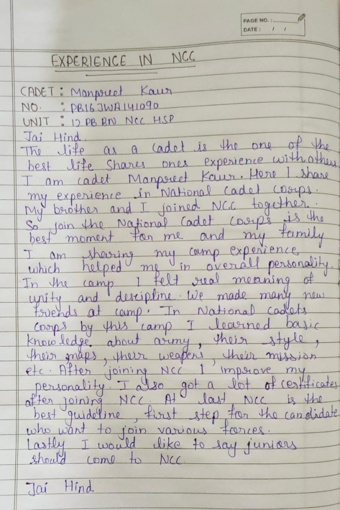 Manpreet Kaur GSSSS AMBALA JATTAN 12 PB BN NCC HSP GP HQ JALANDHAR