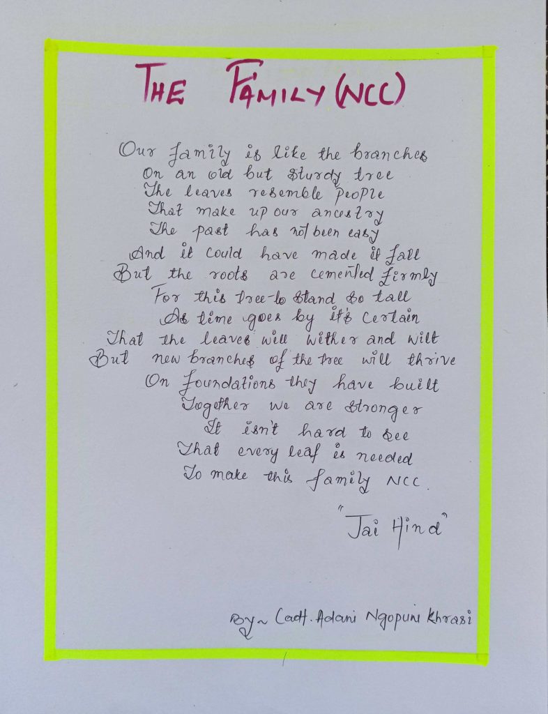 I am Cdt Adani Ngopuni khrasi, a student of Patkai Christian College, Nagaland. Writing this poem to show the affection and emotions I have for our organization(NCC)