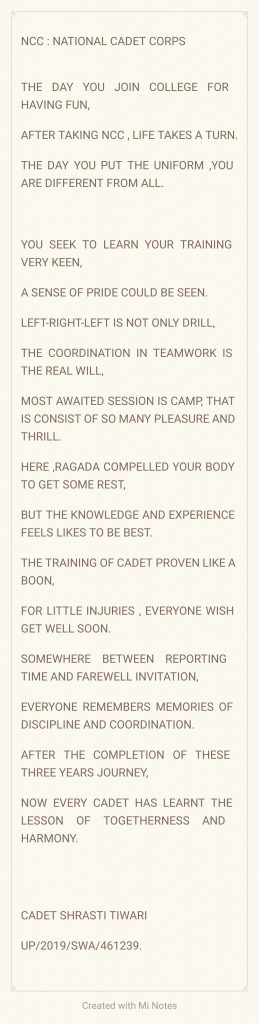 Name- Cadet Komlika Singh Reg.no.- UP/2019/SWA/461232 Year- 2nd yr
