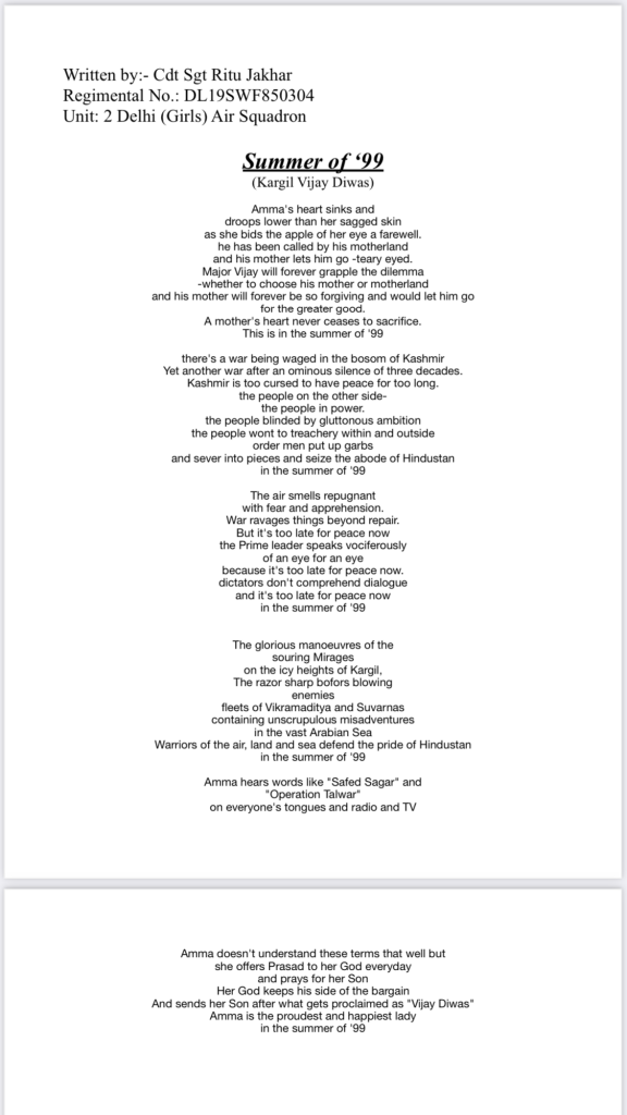 Written by: Cdt Sgt Ritu Jakhar DL19SWF850304 Unit: 2DGAS Summer of ‘99 is a poem dedicated to all brave soldiers of our country, for the supreme sacrifice made by them during ‘Operation Vijay’.