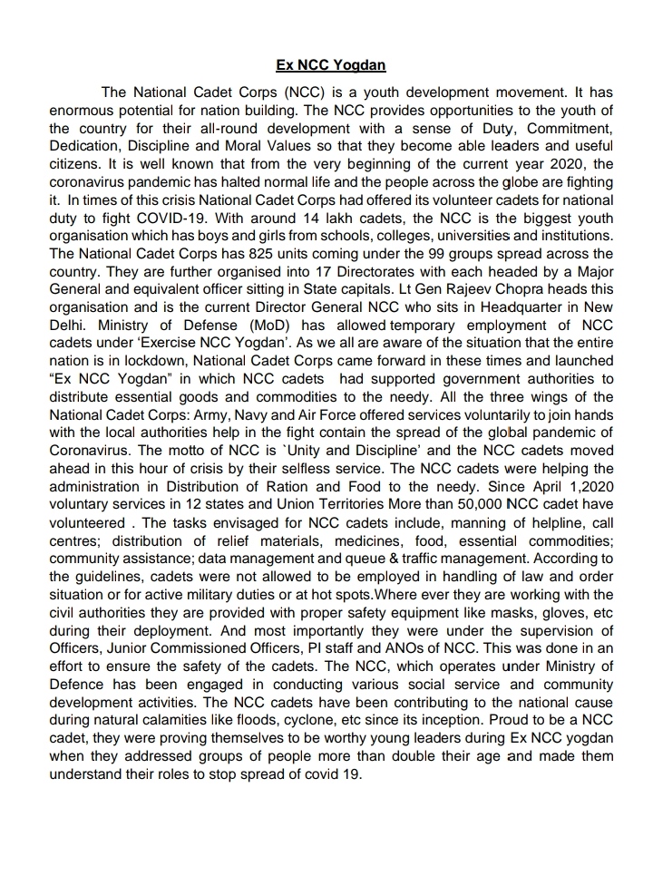 National Cadet Corps (NCC) has offered a helping hand to civilian authorities in the country’s fight against COVID-19 by extending the services of cadets under ‘Exercise NCC Yogdan’.
