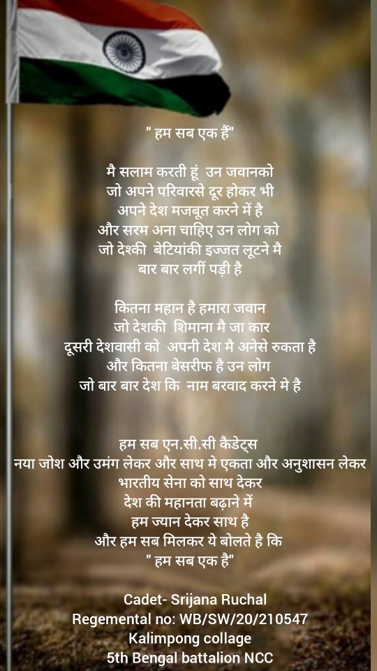 Hello I am SUO Anandita Paul, a SW NCC cadet of west bengal & sikkim directed, 'Kol-C' group, 20 bengal BN NCC unit. I am studying in graduation, B.Sc. honours. Alcohol and smoking is injurious to health. And I draw this in this picture