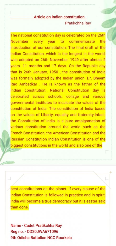 Article on Indian constitution Name - Cadet Pratikchha Ray Reg no. - OD20JWA671096 9th (O) Bn NCC, Rourkela