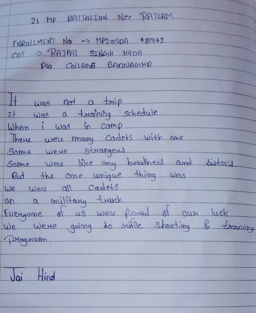 Cadet- Khilare Amar Jagannath Regiment number- MH/20/SDA/900717 NCC UNIT: 2 MAH BN, NCC PUNE, D COY NAME OF THE INSTITUTION: T.C.COLLEGE, BARAMATI