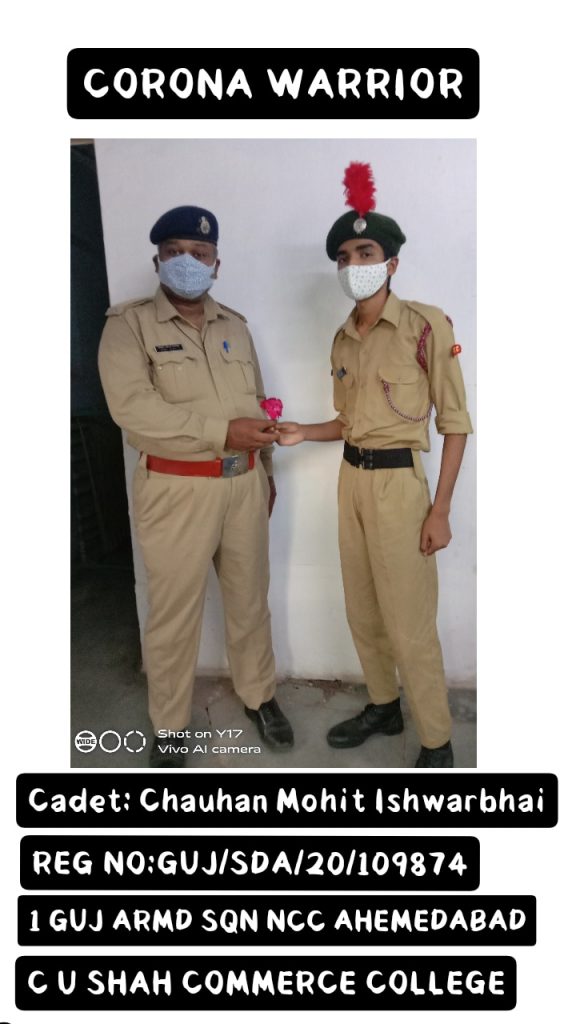 PH4 connected wid corona warrior Cadet Mohit I Chauhan Reg. No. GUJ/SDA/20/109874 Gujarat DTE 1,GUJ ARMD SQN NCC. Ahemedabad meet to Constable Bharat BHAi Rathod thank him.