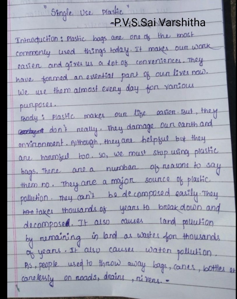 This is an essay about evils of single use of plastic by N.Thanmai Krupa 2nd year. Apjw/2020/289907. Thank you.